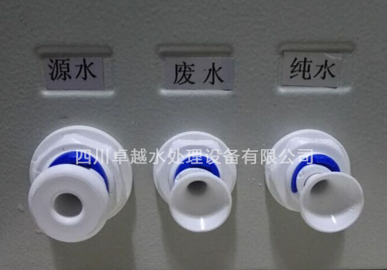 超純水機在出廠前都會用堵頭,堵著源水,廢水,純水三個接口。如圖所示: