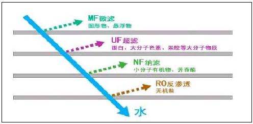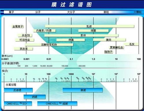 分離膜是具有選擇性分離功能的材料,利用膜的選擇性分離實(shí)現(xiàn)料液的不同組分的分離、純化、濃縮的過(guò)程稱作膜分離。它與傳統(tǒng)過(guò)濾的不同在于,膜可以在分子范圍內(nèi)進(jìn)行分離,并且這過(guò)程是一種物理過(guò)程,不需發(fā)生相的變化和添加助劑。膜的孔徑一般為微米級(jí),依據(jù)其孔徑的不同(或稱為截留分子量),可將膜分為微濾膜、超濾膜、納濾膜和反滲透膜,根據(jù)材料的不同,可分為無(wú)機(jī)膜和有機(jī)膜,無(wú)機(jī)膜主要是陶瓷膜和金屬膜,其過(guò)濾精度較低,選擇性較小。有機(jī)膜是由高分子材料做成的,如醋酸纖維素、芳香族聚酰胺、聚醚砜、聚氟聚合物等等。錯(cuò)流膜工藝中各種膜的分離與截留性能以膜的孔徑和截留分子量來(lái)加以區(qū)別,下圖簡(jiǎn)單示意了四種不同的膜分離過(guò)程:(箭頭反射表示該物質(zhì)無(wú)法透過(guò)膜而被截留):