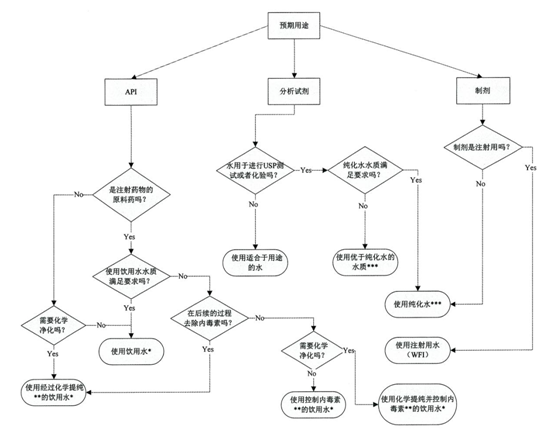 在《美國藥典》制藥用途水中有專門的論述,并有一個(gè)圖可供參考USP32 1231 Fig. 2 Selection of water for pharmaceutical purposes.