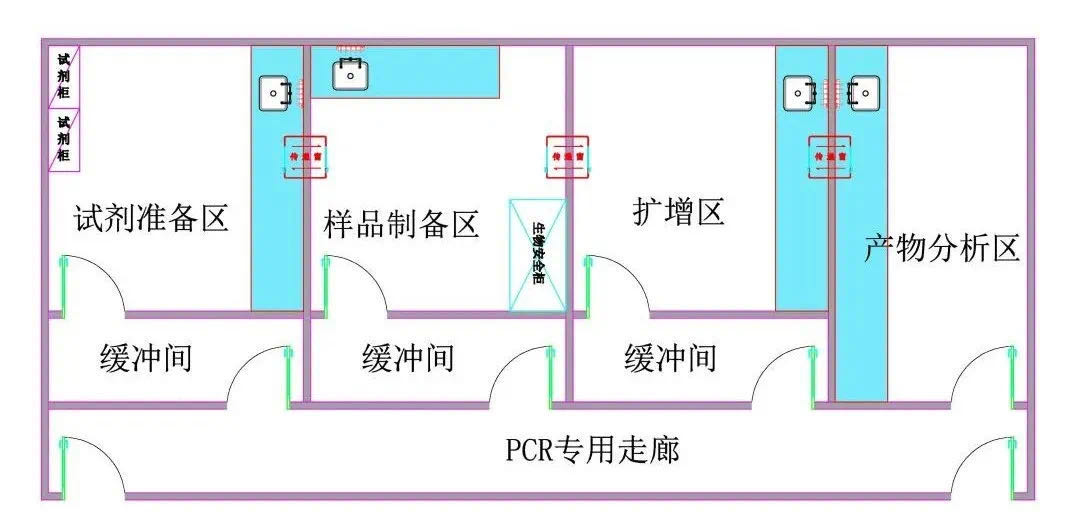 PCR實(shí)驗(yàn)室原則.上分為四個(gè)單獨(dú)的工作區(qū)域:試劑準(zhǔn)備區(qū)、標(biāo)本制備區(qū)、擴(kuò)增區(qū)和擴(kuò)增產(chǎn)物分析區(qū)。為避免交叉污染,進(jìn)入各個(gè)工作區(qū)域必須嚴(yán)格遵循單一方向原則,即只能從試劑準(zhǔn)備區(qū)→標(biāo)本制備區(qū)擴(kuò)增區(qū)>擴(kuò)增產(chǎn)物分析區(qū),不得逆向流動(dòng),并且各區(qū)完全獨(dú)立,如為一個(gè)區(qū)套一個(gè)區(qū)的模式,區(qū)間不能直通,則必須建有緩沖間,保證兩個(gè)區(qū)域間始終處于隔離狀態(tài)。
